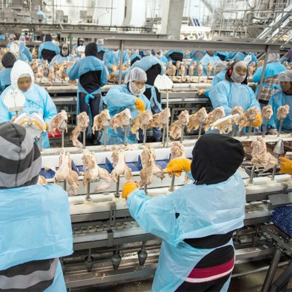 4)掛雞人員從雞籠里托著雞腹拿出毛雞,再將兩雞爪掛在生產(chǎn)流水線的掛架上。每個掛雞人員每小時可掛毛雞800-1000只。